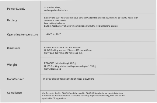The PD240CB is a Hand Held Metal Detector that combines high reliability and ergonomics with advanced detection and operator signaling features. Long detection range for weapons and minimum metal targets, effective sensitivity to all alloys, exceeds the latest Security Standards and has high immunity to external metal masses.